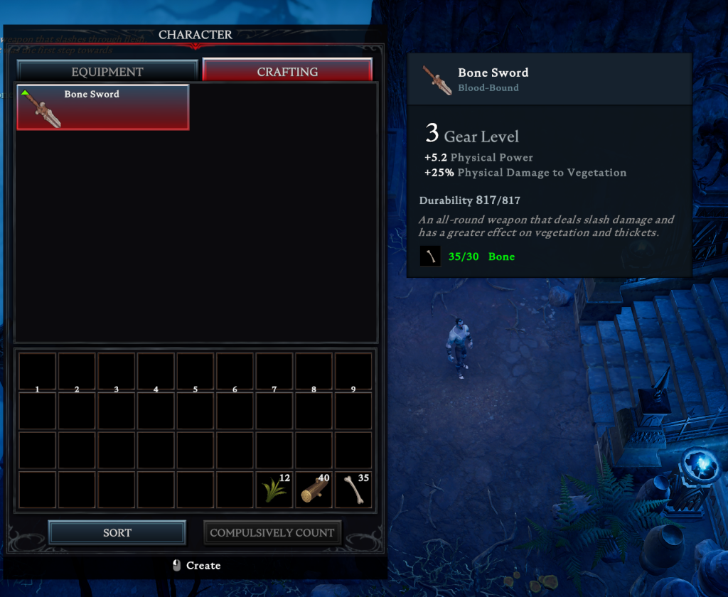 Guide: Craft a Bone Sword by clicking <tab> and then click the Crafting button. Roam the graveyard and kill 3 enemies.